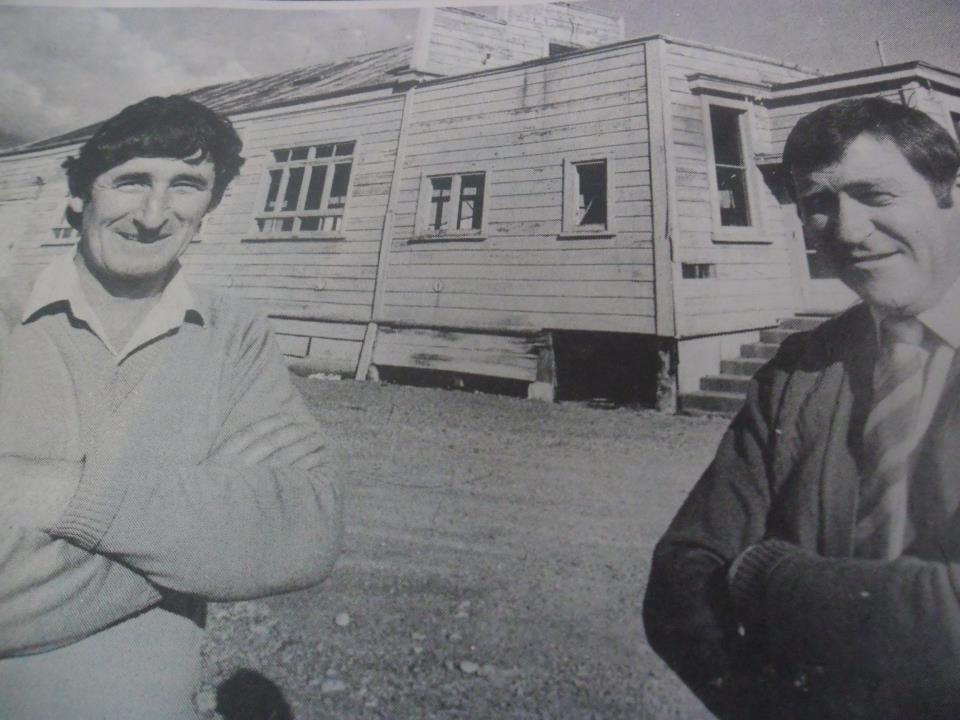 Tom Hayes (L) & Maurice Cotterill (R) with Silverdale cafeteria in background. Building used to be the original Lodge hall.